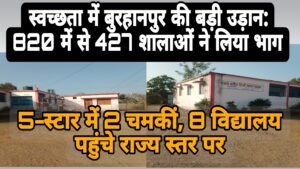 जिले की 117 शालाओं में से 8 शालाओं का सर्वेक्षण में उच्च स्कोर रहा। जिनका चयन राज्य स्तर के लिए हुआ है। इनमें एमएस गर्ल्स आश्रम इंलीश खकनार, एमएस बड़गांव माफी 5 स्टार ग्रामीण में है। वहीं बॉयस आश्रम सीवल ग्रामीण, उर्दु गर्ल्स हायर सेकेंडरी स्कूल हरीपुरा बुरहानपुर शहरी, पीएस राममंदिर चिंचाला शहरी एवं एवीपी ग्लोबल स्कूल बुरहानपुर, हायर सेकेंडरी स्कूल चापोरा और हायर सेकेंडरी स्कूल झेवीयर इंटरनेशन स्कूल सभी ग्रामीण शालाएं 4 स्टार में शामिल है।