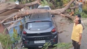 विद्या नगर में गुलमोहर का पेड़ गिरा, दो कारें क्षतिग्रस्त, बड़ा हादसा टला।
